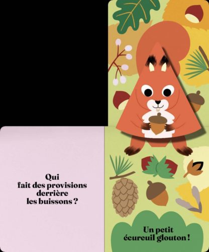 Il s’en passe des choses dans cette forêt. L’enfant va devoir deviner quels animaux s’y cachent en soulevant les flaps. « Qui fait des provisions derrière les buissons ? Un petit écureuil glouton. » Et qui ronfle couché dans son terrier ? Un raton-laveur rêveur. Qui a volé la tarte de Mémé ? Un petit renard rusé.