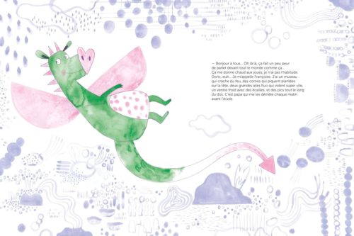 Pourtant, elle possède bien des caractéristiques fantastiques : un museau qui crache du feu, des ailes fluorescentes, des écailles et des cornes. Mais puisqu’elle veut raconter elle-même son histoire, elle se lance. « Oh là là, ça fait un peu peur de parler devant tout le monde comme ça. »