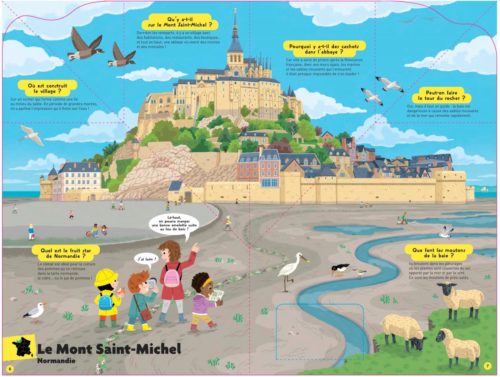 Parmi les plus beaux sites, une grande page est à déployer pour admirer la baie du Mont Saint-Michel et découvrir d’autres sites : le village de Giverny, l’aiguille d’Étretat et les maisons à colombage. On trouve aussi des dolmens en pop-up pour découvrir les secrets du site de Carnac et d’autres sites bretons dont la forêt de Brocéliande.