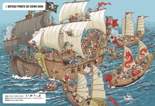 Ainsi pour la double page « Le bateau pirate de Ching Shih », l’enfant doit trouver des détails commençant par « s » et « t », pour le niveau moyen et « 10 armes étranges » pour le « difficile ». Dans le village indien de Sacajawae, il doit chercher six détails commençant par la lettre « b » et 4 par la lettre « v ».