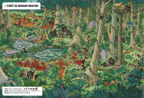 Un livre ludique avec des illustrations fourmillantes de détails et pleines d’humour pour des heures de jeu et de rire. Le lecteur s’offre aussi un voyage dans le temps puisqu’il se retrouve aussi bien dans un décor du Far West que dans la forêt de la première femme africaine à recevoir le prix Nobel de la paix.