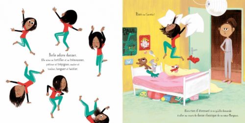 Perle adore danser. « Elle aime se tortiller et se trémousser, piétiner et trépigner, sauter et tomber, tanguer et twister. » Elle veut donc logiquement accompagner sa soeur Margaux au cours de danse classique. Sur le chemin, son aînée lui rappelle qu’elle doit être gracieuse et élégante et surtout écouter la professeure.