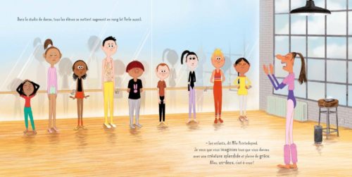 Si les autres donnent l’impression de danser avec un paon, un tigre, un chat, un jaguar, pour Perle, c’est différent : « BADAM ! BOUM ! PLOF ! BAM ! » Mlle Pointedepied crie : « On dirait que tu danses avec un dinosaure ! » Et elle ajoute : « Ne danse JAMAIS avec un dino. Ils sont bien trop lourdauds, patauds, brutes et rustauds. »