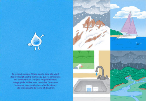 Après le soleil et la lune, c’est donc au tour de la Terre de se raconter dans un nouvel album intelligent. « Oh ! Une de mes petites créatures ! Coucou toi, c’est moi, ta planète, la Terre ! » C’est ainsi que la planète bleue va directement s’adresser au lecteur. Elle explique que son nom vient du fait que l’eau recouvre les deux tiers de sa surface.