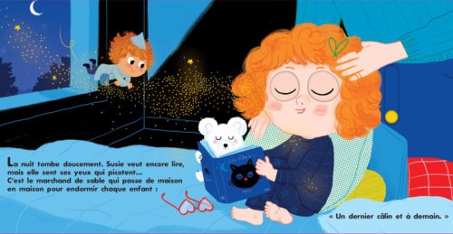 « La nuit tombe doucement. Susie veut encore lire, mais elle sent ses yeux qui picotent… C’est le marchand de sable qui passe de maison en maison pour endormir chaque enfant : ‘Un dernier câlin et à demain’. » Son parent est là pour récupérer le livre et les lunettes.
