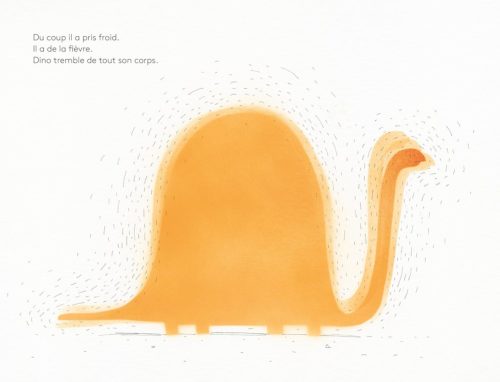La pluie se met à tomber et Dino ne peut se protéger avec sa grande taille : il est trempé. « Du coup il a pris froid. Il a de la fièvre. » Dino tremble si fort de tout son corps que ses os s’entrechoquent. Un vrai concert. Puis la nuit tombe et Dino décide de dormir un peu : se reposer lui fera sûrement du bien.