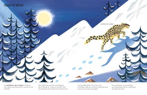 Mais, dans la montagne, la panthère des neiges, elle, aime être seule. « Camouflée grâce à sa fourrure tachetée, elle se confond parfaitement avec les rochers enneigés. » L’aigle royal préfère les hauteurs, le blaireau, comme le lapin, les profondeurs. Les castors construisent des maisons-forteresses. Le singe-araignée vit dans les arbres.