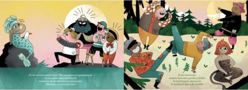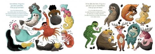 Anémone est une sirène et vit « là où la mer est plus bleue que bleu ». Sylvia est une elfe des bois et habite dans la forêt « plus verte que vert ». D’un côté, il y a des sirènes toutes différentes et « c’est ça qui est bien » : sirènes-morues, sirènes-crevettes… De l’autre, des elfes dont pas deux ne se ressemblent : elfes-hérissonnes, elfes-lynx…