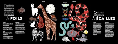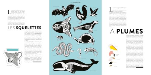 On trouve les insectes, les arthropodes, les invertébrés et les vertébrés qui eux-mêmes ont des sous-classes. Puis voici une double-page consacrée aux squelettes. On découvre « l’intérieur » des animaux comme avec une radio pour mieux comprendre les différences qu’il peut exister entre un phoque et une baleine boréale par exemple.
